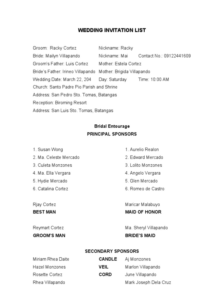 Wedding Invitation List Of Entourage Sample / Wedding organisers check list banquet chair hire.